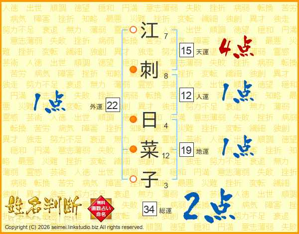 生活面を象徴する運勢です。外部から受ける影響力を表し、結婚運、家庭運や職場、環境への順応性を表します。総運から人運を引いた画数。姓や名が1文字の場合を除く。