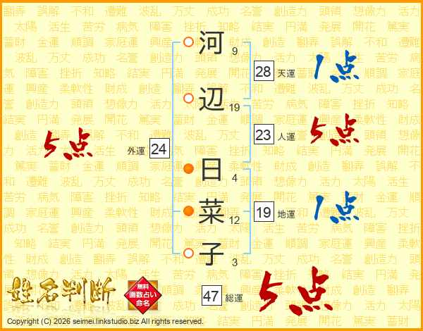 河(9画)辺(19画) 日(4画)菜(12画)子(3画)