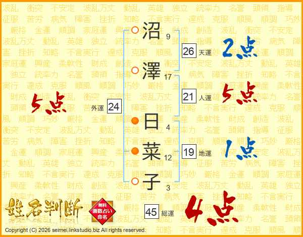 沼(9画)澤(17画) 日(4画)菜(12画)子(3画)