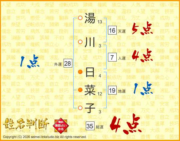 湯(13画)川(3画) 日(4画)菜(12画)子(3画)