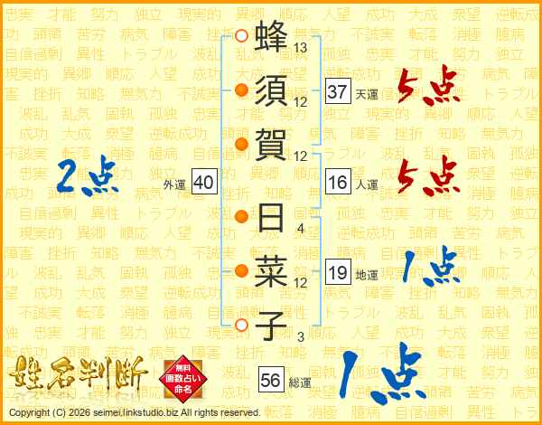 蜂須賀日菜子さんの天運は37画の5点!