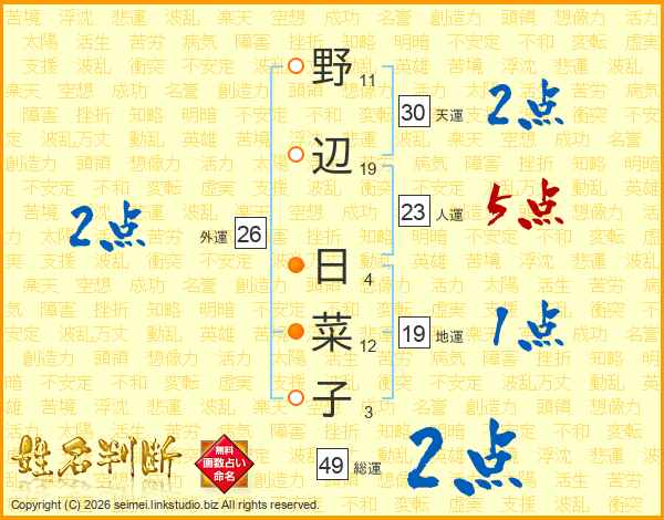 野(11画)辺(19画) 日(4画)菜(12画)子(3画)