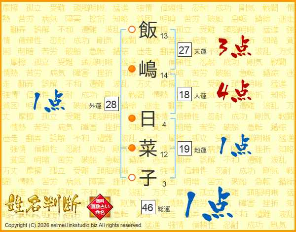 飯(13画)嶋(14画) 日(4画)菜(12画)子(3画)