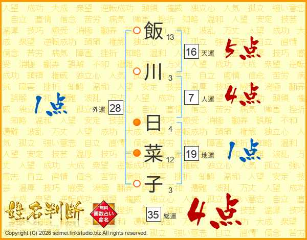 飯(13画)川(3画) 日(4画)菜(12画)子(3画)