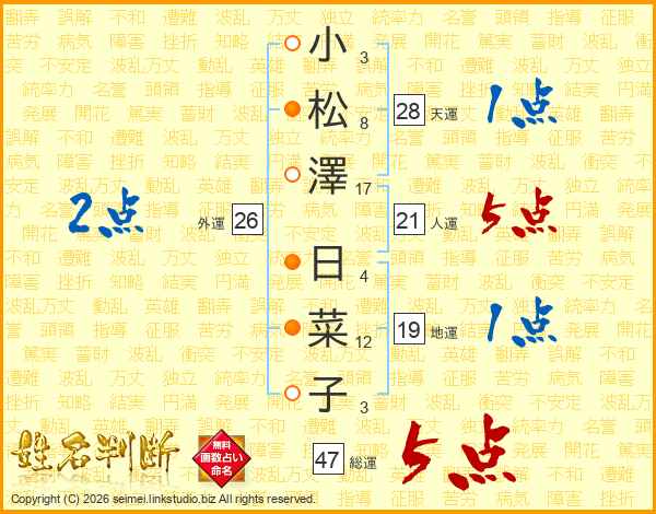 小(3画)松(8画)澤(17画) 日(4画)菜(12画)子(3画)