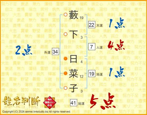 藪下日菜子さんの総運は41画の5点!