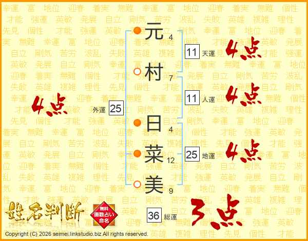 元(4画)村(7画) 日(4画)菜(12画)美(9画)