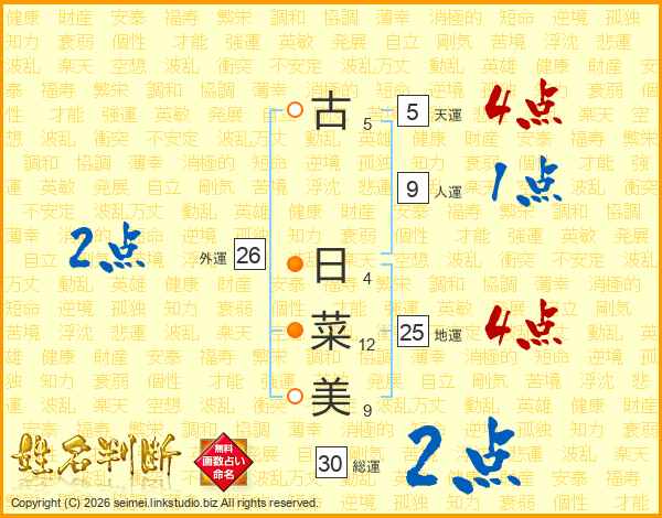生活面を象徴する運勢です。外部から受ける影響力を表し、結婚運、家庭運や職場、環境への順応性を表します。総運から人運を引いた画数。姓や名が1文字の場合を除く。