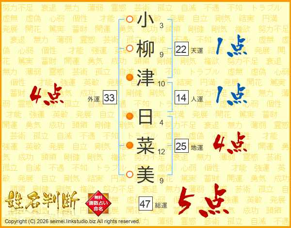 小(3画)柳(9画)津(10画) 日(4画)菜(12画)美(9画)