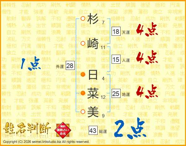 杉(7画)崎(11画) 日(4画)菜(12画)美(9画)