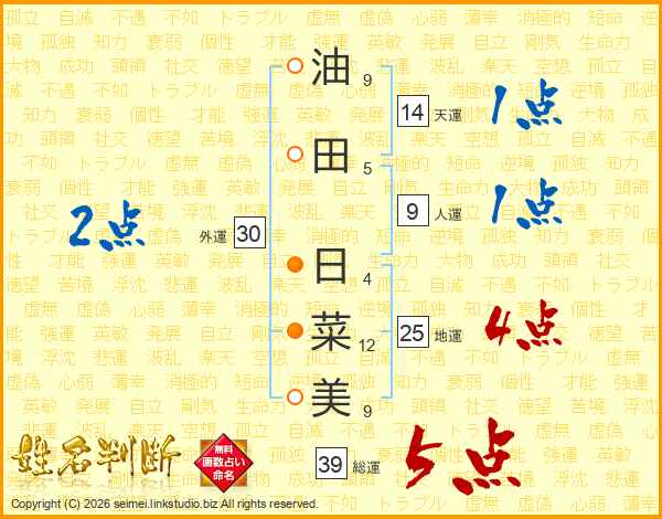 油田日菜美さんの総運は39画の5点!