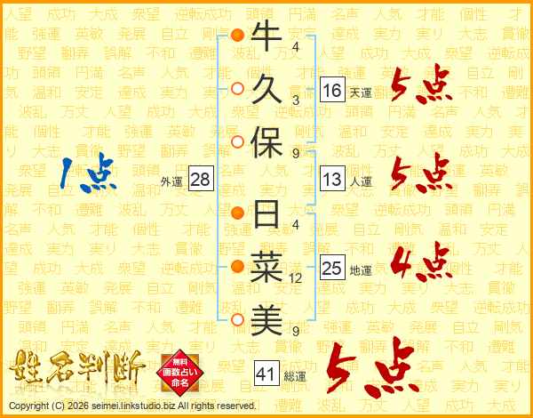 牛(4画)久(3画)保(9画) 日(4画)菜(12画)美(9画)