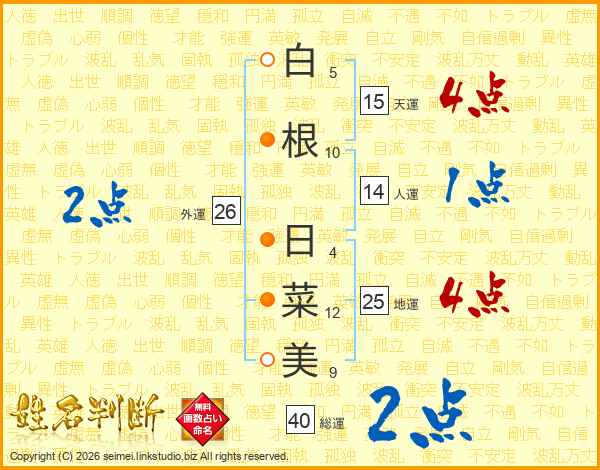 生活面を象徴する運勢です。外部から受ける影響力を表し、結婚運、家庭運や職場、環境への順応性を表します。総運から人運を引いた画数。姓や名が1文字の場合を除く。