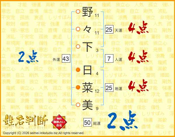野(11画)々(11画)下(3画) 日(4画)菜(12画)美(9画)