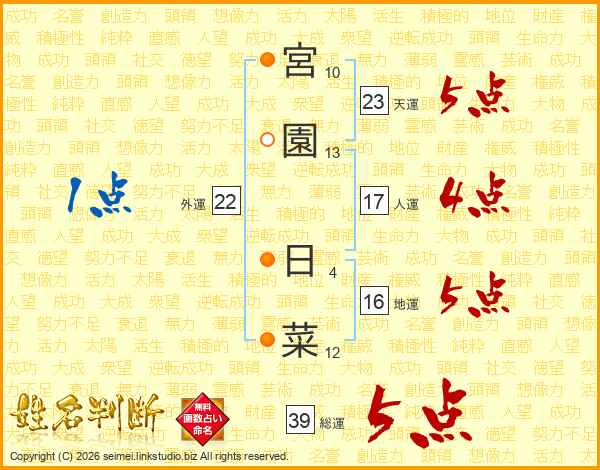 宮園日菜さんの総運は39画の5点!