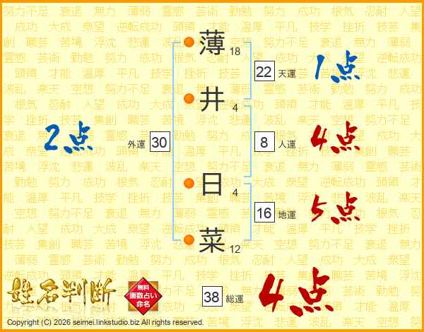 薄(18画)井(4画) 日(4画)菜(12画)