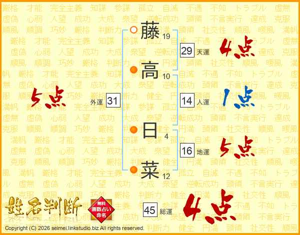 生活面を象徴する運勢です。外部から受ける影響力を表し、結婚運、家庭運や職場、環境への順応性を表します。総運から人運を引いた画数。姓や名が1文字の場合を除く。