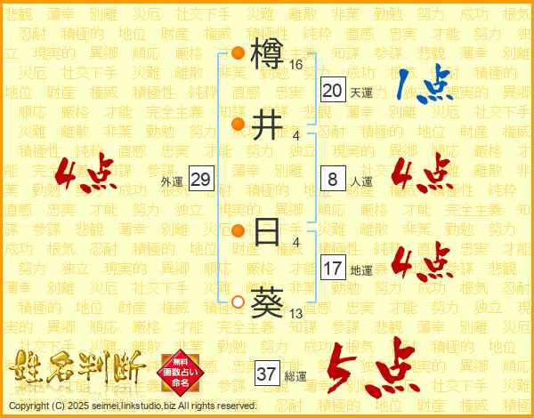 樽井日葵さんの総運は37画の5点!