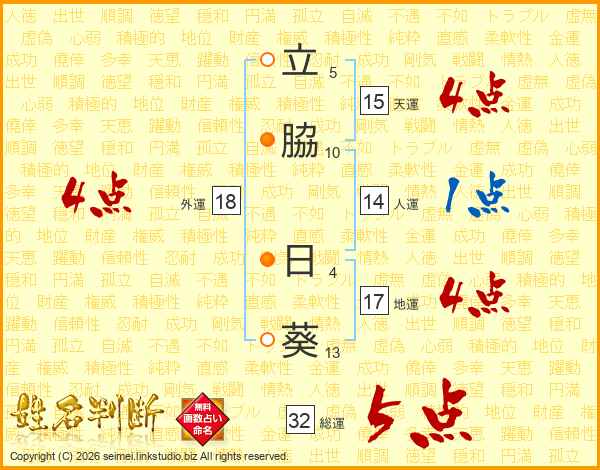 生活面を象徴する運勢です。外部から受ける影響力を表し、結婚運、家庭運や職場、環境への順応性を表します。総運から人運を引いた画数。姓や名が1文字の場合を除く。