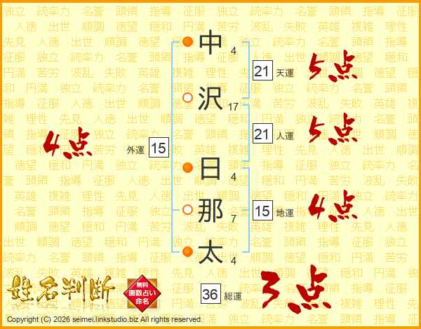 中(4画)沢(17画) 日(4画)那(7画)太(4画)