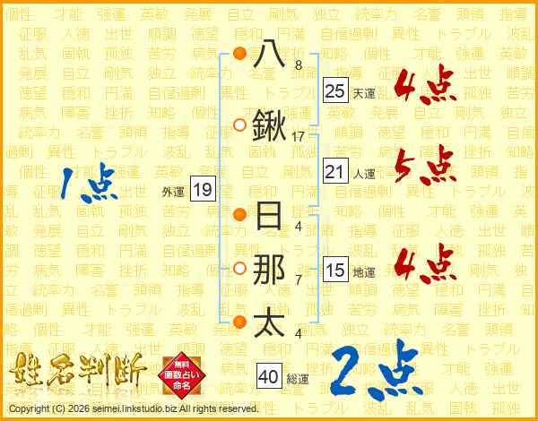 八(8画)鍬(17画) 日(4画)那(7画)太(4画)