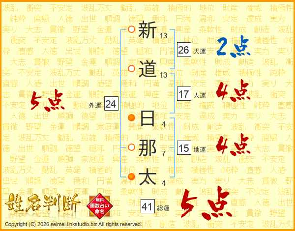 新道日那太さんの総運は41画の5点!
