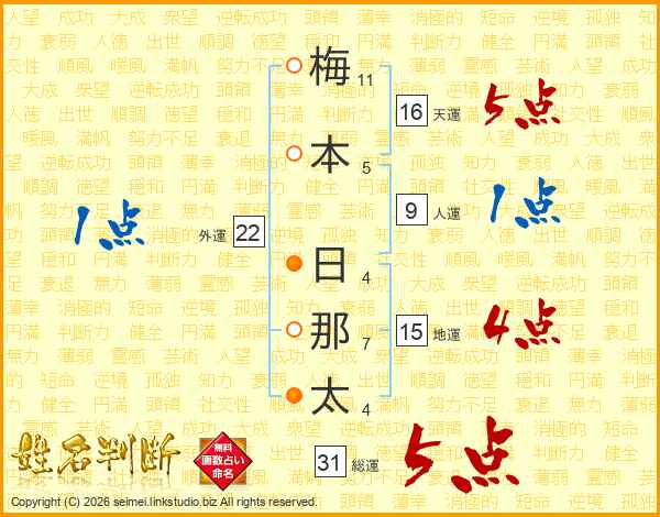 梅(11画)本(5画) 日(4画)那(7画)太(4画)