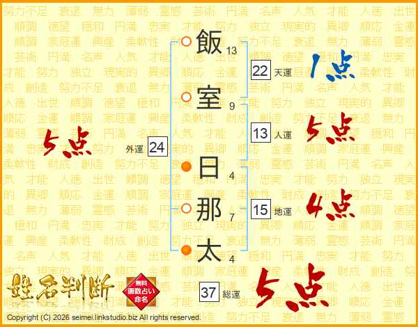 飯室日那太さんの総運は37画の5点!
