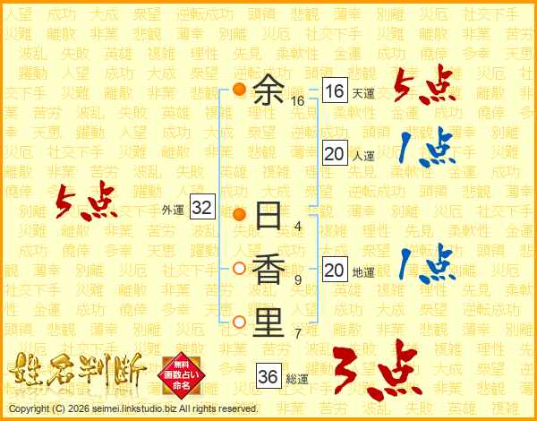生活面を象徴する運勢です。外部から受ける影響力を表し、結婚運、家庭運や職場、環境への順応性を表します。総運から人運を引いた画数。姓や名が1文字の場合を除く。
