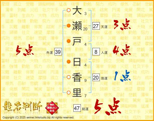 大(3画)瀬(20画)戸(4画) 日(4画)香(9画)里(7画)
