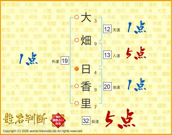 大(3画)畑(9画) 日(4画)香(9画)里(7画)