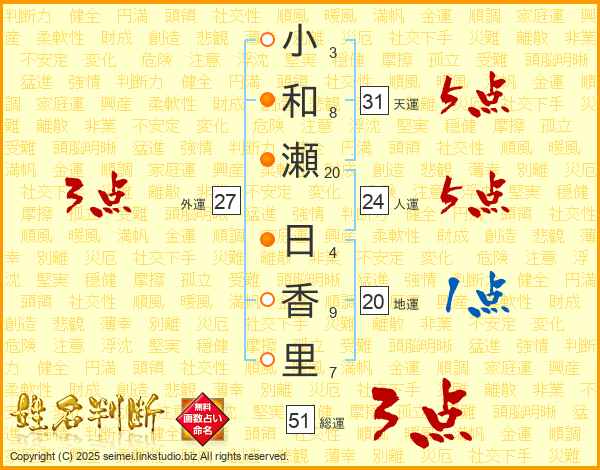 小(3画)和(8画)瀬(20画) 日(4画)香(9画)里(7画)