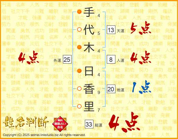 手(4画)代(5画)木(4画) 日(4画)香(9画)里(7画)
