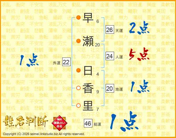 早瀬日香里さんの総運は46画の1点!