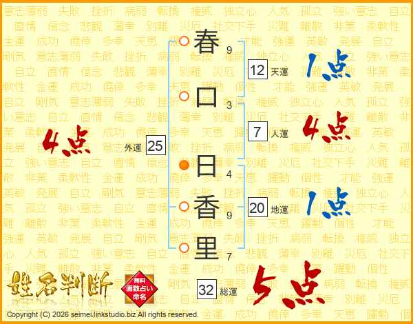 春(9画)口(3画) 日(4画)香(9画)里(7画)