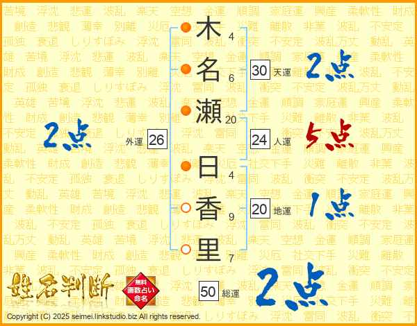 木(4画)名(6画)瀬(20画) 日(4画)香(9画)里(7画)