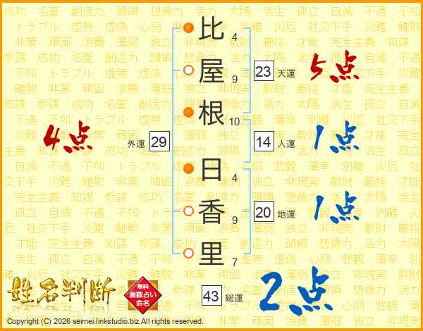 比(4画)屋(9画)根(10画) 日(4画)香(9画)里(7画)