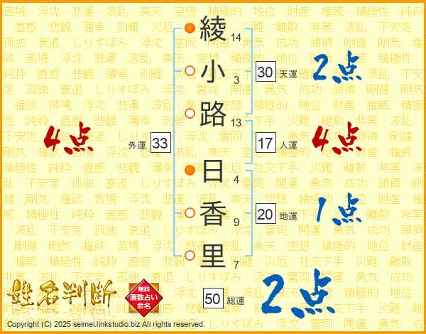 綾(14画)小(3画)路(13画) 日(4画)香(9画)里(7画)