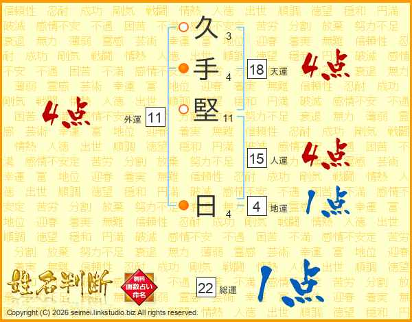 生活面を象徴する運勢です。外部から受ける影響力を表し、結婚運、家庭運や職場、環境への順応性を表します。総運から人運を引いた画数。姓や名が1文字の場合を除く。