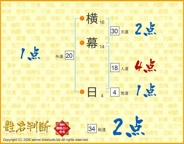 生活面を象徴する運勢です。外部から受ける影響力を表し、結婚運、家庭運や職場、環境への順応性を表します。総運から人運を引いた画数。姓や名が1文字の場合を除く。