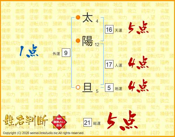 生活面を象徴する運勢です。外部から受ける影響力を表し、結婚運、家庭運や職場、環境への順応性を表します。総運から人運を引いた画数。姓や名が1文字の場合を除く。