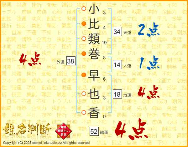 小(3画)比(4画)類(19画)巻(8画) 早(6画)也(3画)香(9画)