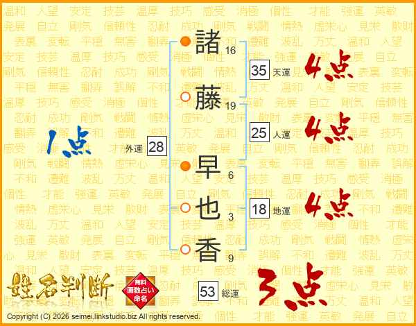 諸(16画)藤(19画) 早(6画)也(3画)香(9画)