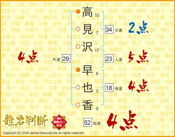 高(10画)見(7画)沢(17画) 早(6画)也(3画)香(9画)