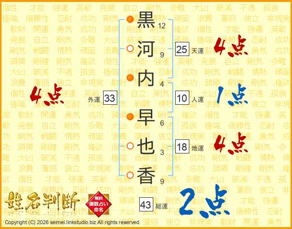 黒(12画)河(9画)内(4画) 早(6画)也(3画)香(9画)