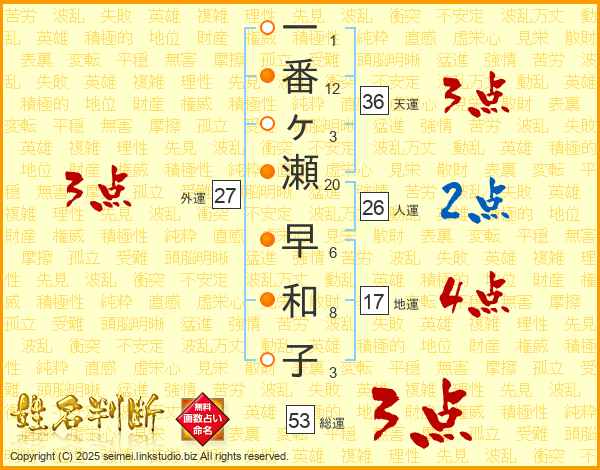 一番ヶ瀬早和子さんの総運は53画の3点!
