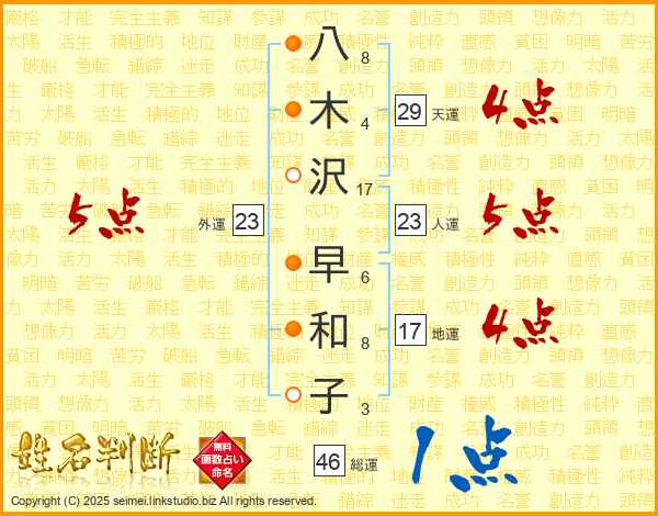 八(8画)木(4画)沢(17画) 早(6画)和(8画)子(3画)