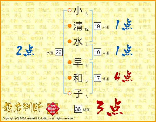 小(3画)清(12画)水(4画) 早(6画)和(8画)子(3画)