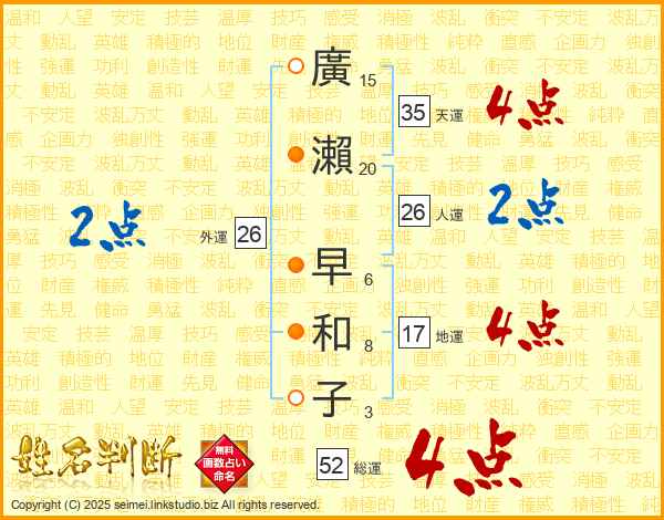 廣瀨早和子さんの総運は52画の4点!