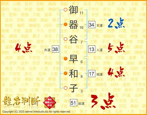 御(11画)器(16画)谷(7画) 早(6画)和(8画)子(3画)